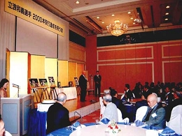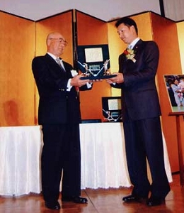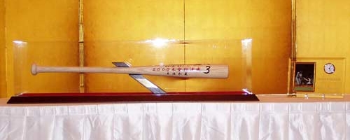 多田監督よりレリーフの贈呈 更に祝辞が続いた後、ナニワボーイズ・多田監督が記念のレリーフを贈り「7月5日はテレビで見ていて絶対今日はやるぞと思っていたら、その通りになりました。一塁ベースでガッツポーズは見せませんでしたが達成感にあふれていました。その姿に感動しました。ありがとう!立浪と叫びたくなりました。次は福本選手の持つ二塁打の日本記録449本の更新をめざして下さい。立浪選手はナニワボーイズの誇りです。