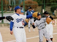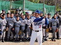 バッティングの指導 キャプテンの重久君は「守備でグラブが上から出ている、下から出せと言われました。投球ではヒジが下がらないように注意されました」 と言い、1年生の谷口君は「上から振った方が打球が伸びると言われ、 その通りにできました」とにっこり。 最後に立浪選手は「練習はばく然とするのではなく、 どうしたらうまくなるか考えて、目標をもって上をめざして下さい。